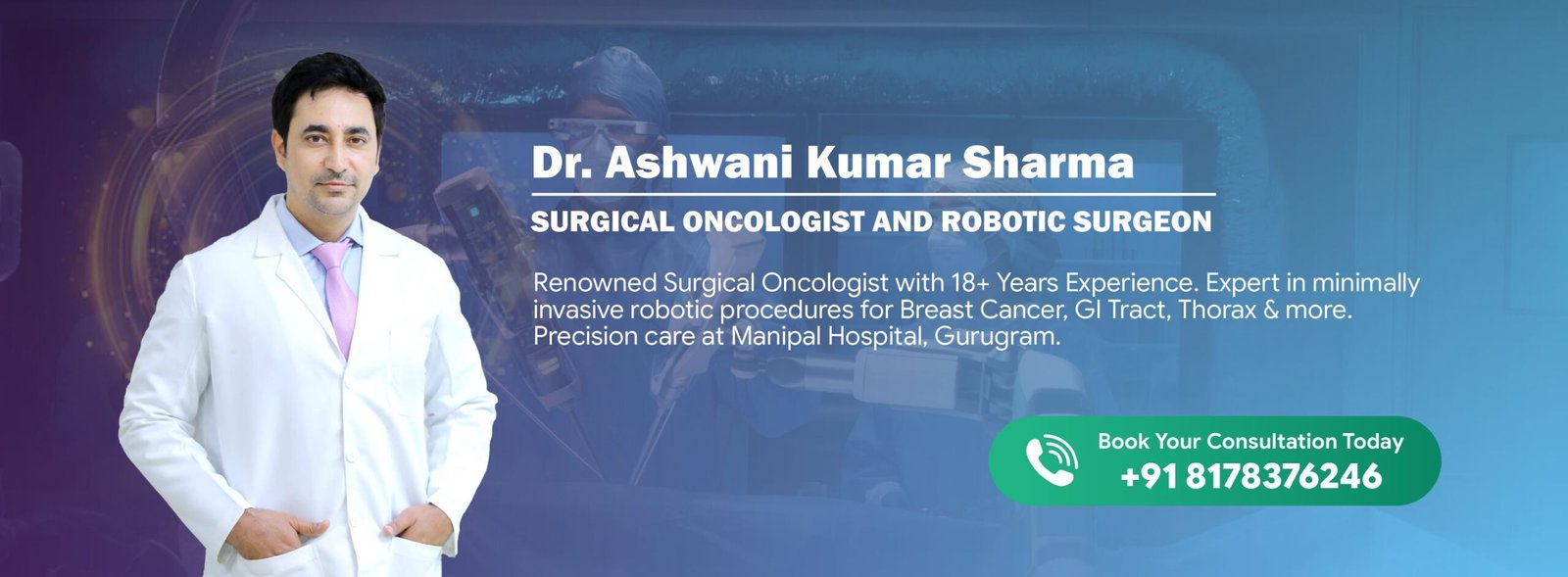 With extensive experience across head and neck, thoracic, gastrointestinal, breast, and gynecological cancers, Dr. Ashwani Sharma brings deep clinical expertise. His proficiency in advanced robotic and minimally invasive surgeries ensures precise treatment, better outcomes, and safer surgical care guided by years of hands-on oncology practice.
